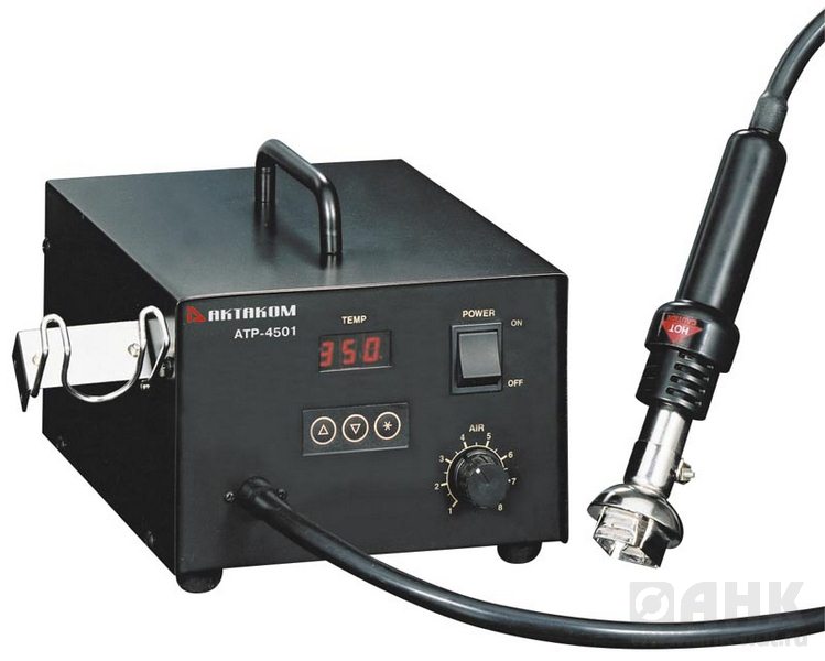 Паяльная станция предназначена для монтажа и демонтажа электронных компонентов при помощи горячего воздуха и может применяться для схем SOIC, CHIP, QFP, PLCC, BGA и т. д. Станция АТР-4501 может успешно использоваться с держателем нагревателя АТР-9702 и держателем плат АТР-9703 (комплект АТР-9701).