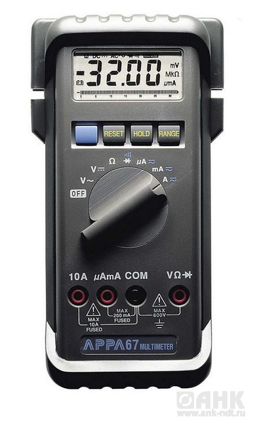 Мультиметр цифровой APPA 67 (APPA Technology Corporation): Постоянное напряжение 300 мВ - 600 В; Переменное напряжение 3 В-600 В; Постоянный ток 300 мкА-20 А; Переменный ток 300 мкА-20 А; Сопротивление 300 Ом-30 МОм; Удержание показаний; Прозвонки; Дополнительная линейная шкала.