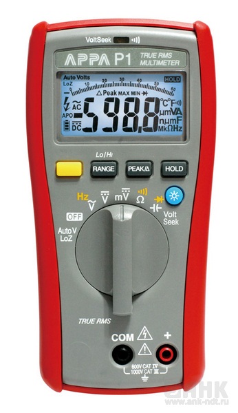 Мультиметр True-RMS, диапазоны измерения U пост. 600 мВ/ 6/ 60/ 600/ 1000 В (±0,5%), U пер. 600 мВ/ 6/ 60/ 600/ 1000 В (разр. 0,1 В), I пост/пер. 6/ 10 А (разр. 1 мА), сопр. 600 Ом/ 6/ 60/ 600 кОм/ 6/ 40 МОм, частоты (U/I) 100/ 1000 Гц/ 10/ 100 кГц, ёмкости 1/ 10/ 100 мкФ/ 1/ 10 мФ (разр. 1 нФ), проверка целостности/ прозвонка (0…600 Ом), p-n., Min/ Max, изм. и удерж. пиковых зн. (от 1 мс), Smart Data Hold, бесконт. индикатор напряжения (VoltSeek), низкоимпедансный вход (LoZ), ЖК-индикатор (6.000) с подсветкой, граф. шкала (60 сегм.), автоотключение через 20 мин., 1×9 В ( «Крона»), 74 х 156 х 44 мм, масса 250  г