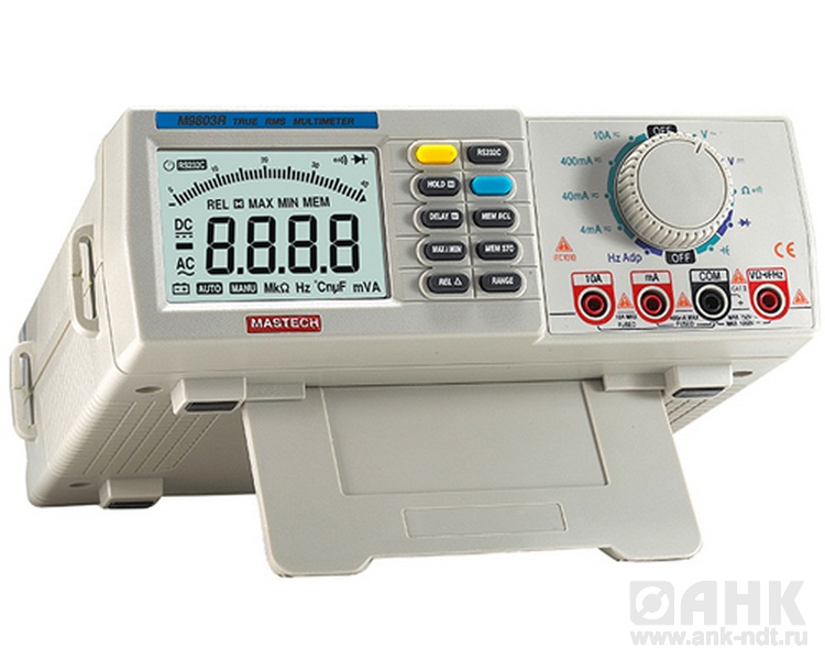 Настольный профессиональный цифровой мультиметр M9803R обеспечивает высокую точность измерений. ПК – интерфейс RS232. Линейная и цифровая шкала. Режим относительных измерений (REL). Питание от сети или батареи. Режим DELAY-HOLD. Среднеквадратические измерения.