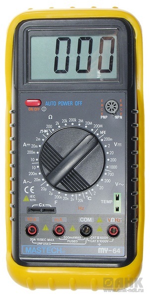 Цифровой мультиметр MY-64 имеет богатый набор функций. С помощью него можно измерять величины силы постоянного и переменного тока, постоянного и переменного напряжения, сопротивления, коэффициента усиления биполярных транзисторов, емкость конденсаторов, температуру окружающей среды и частоту синусоидального сигнала в звуковом диапазоне. Высокое входное сопротивление не вносит погрешности при измерениях величин и говорит о высокой точности прибора. В приборе применен АЦП с измерением значений методом двойного интегрирования. Выбор пределов измерения величин производится вручную путем установки нужного положения многопозиционного переключателя.
