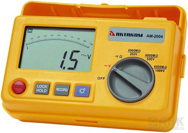 • Цифровой мегаомметр: измерение сопротивления изоляции 0,1 МОм...4 ГОм напряжением: 250, 500, 1000 В; точность 1...2%, дополнительные функции: режимы вольтметра 1...600 В (40...500 Гц), омметр 0,01...40 Ом; ЖКИ 3½; питание 12 В (8 бат.x1,5 В), габариты 190x140x77 мм, масса 0,9 кг.