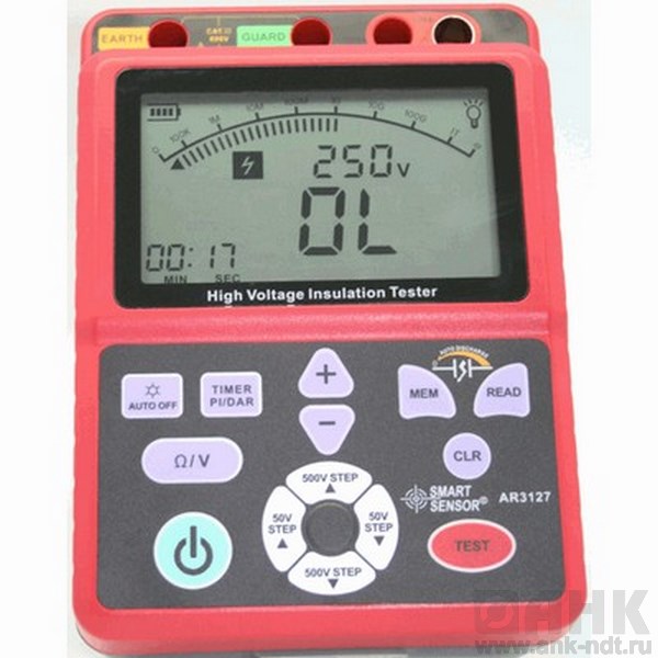 Тестер сопротивления изоляции AR3127 является полноценным мегаомметром. Мегаомметр позволяет производить измерения сопротивления изоляции проводки и различных электротехнических устройств, источников питания, трансформаторов и генераторов. Измеритель сопротивления изоляции может использоваться в мастерских по ремонту электрических устройств. Электрический тестер AR3127 производит измерение  сопротивления  в пределах от 0 до 1000 ГОм, используя для этой цели 5 режимов с номинальным напряжением от 250 до 5000 В. Тестер изоляции имеет возможность калибровки.