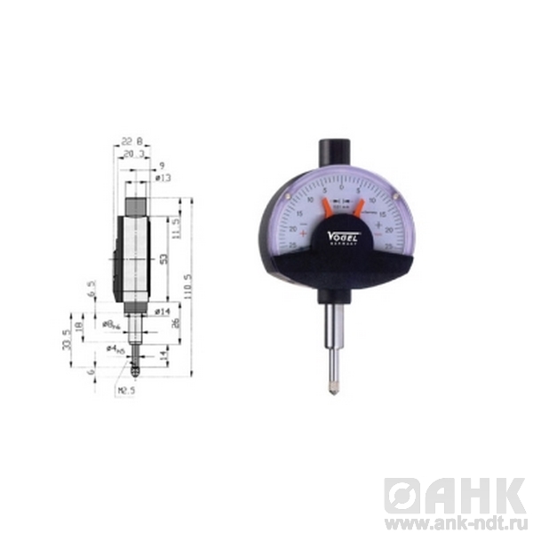 Индикаторы Vogel для проверки плоскостей и параллелей, диапазон от 25-0-25х0,01 мм до 50-0-50х0,001 мм, переставляемые маркеры поля допуска, предназначены для определения линейных размеров деталей, расположения поверхностей и отклонения формы. Принцип действия индикаторов прост: линейное перемещение стержня головки, который находится в непосредственном контакте с измеряемым предметом, преобразуется при помощи определенного типа механизма (рычажного, зубчатого, рычажно-зубчатого, пружинно-оптического или пружинного) в отклонение стрелки устройства. Все измерительные головки имеют собственное обозначение, которое зависит от основного механизма и указывается в маркировке.