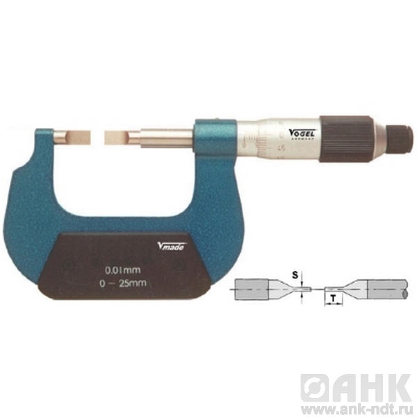 Микрометры Vogel гладкие для измерения пазов диапазон измерений от 0-25х0,01 мм до 75-100х0,01 мм, колки не вращаются, плоские, предназначены для высокоточного определения линейных размеров. Измерение производится абсолютным или относительным контактным способом. Основным преимуществом инструмента является низкая погрешность, которая колеблется в промежутке значений от 2 до 50 мкм и зависит от класса точности микрометра, а также от измеряемого диапазона. В качестве преобразовательного механизма выступает так называемая микропара – винт и гайка.
