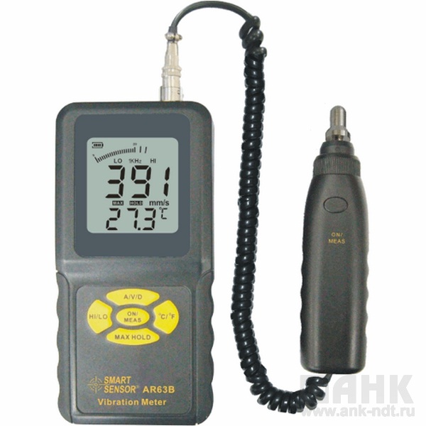 Портативный виброметр AR63B является профессиональным прибором для измерения уровня вибрации. Цифровой виброметр позволяет изменять ускорение, скорость, а также смещение. Все измерения производятся прибором AR63B посредством выносного пьезоэлектрического преобразователя, произведенного из керамического материала. Датчик ускорения передает сигналы вибрации к самому прибору, который преобразует и анализирует измерения. Прибор умеет измерять температуру.Электронный виброметр имеет обширную сферу использования: химическая и нефтяная промышленность, энергетика, транспорт, машиностроение.