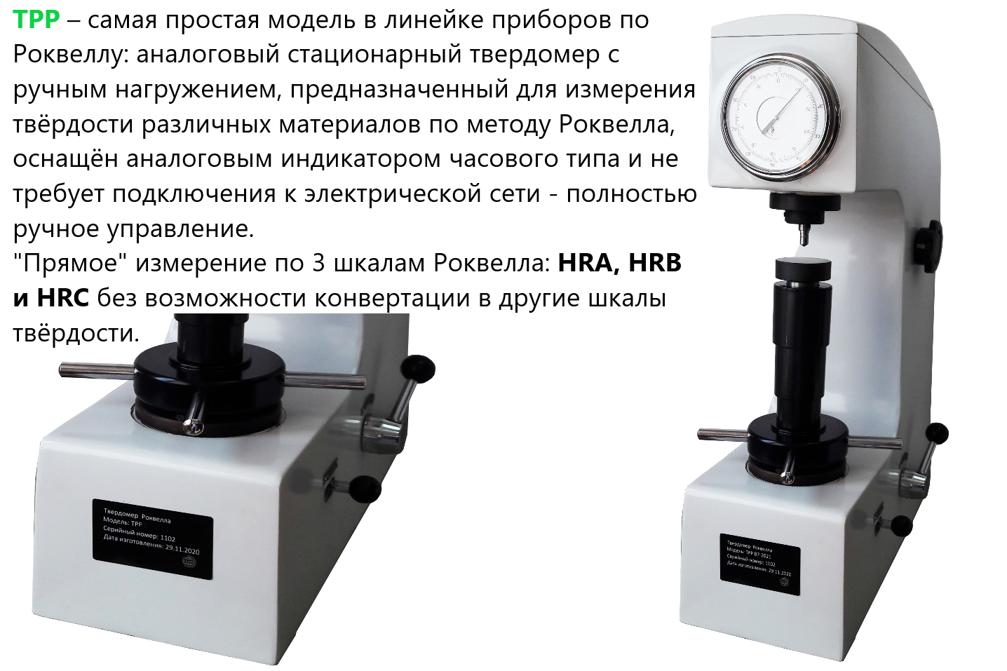 ТРР – самая простая модель в линейке приборов по Роквеллу: аналоговый стационарный твердомер с ручным нагружением, предназначенный для измерения твёрдости различных материалов по методу Роквелла, оснащён аналоговым индикатором часового типа и не требует подключения к электрической сети - полностью ручное управление (условная расшифровка Твердомер Роквелла Ручной).