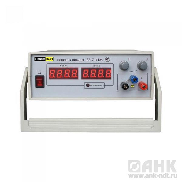 Источник питания лабораторный ПрофКиП Б5-71/1М  предназначен для лабораторных исследований и питания радиоэлектронных и электротехнических устройств постоянным стабилизированным напряжением от 0 В до 30 В, и током от 0 А до 10 А, общей выходной мощностью до 300 Вт. Источник питания лабораторный ПрофКиП Б5-71/1М  имеет защиту нагрузки от превышения величины выходного напряжения заданного уровня и величины выходного тока заданного уровня. Так же имеет защиту от перегрузок, коротких замыканий на выходе прибора и обрывов нагрузки, а также допускает соединение любой выходной клеммы с корпусом. Источник имеет низкую нестабильность выходного напряжения и тока и сохраняет свои технические характеристики при длительной непрерывной работе.