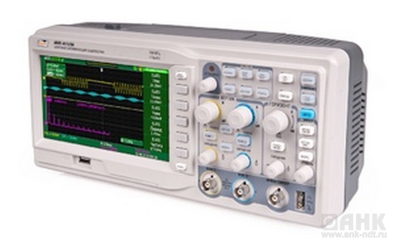 Прибор успешно прошёл испытания на утверждение типа СИ и включён в Госреестр СИ РФ под № 69417-17 (действительно до 23.11.22 г.) 36 Осциллограф цифровой, 2 канала, полоса пропускания 70 МГц, макс. частота дискретиз. 1 ГГц (эквив. 50 ГГц), память 1 МБ на канал (2 МБ – при объед.), авто- и курсорные измерения (32 парам.), расшир. синхр. (фронт, длит., ТВ, вр. нараст., поперем.), интерполяция (Sin X/х, лин.), накопл. (1 с, 2 с, 5 с, беск.), пик. детектор 10 нс; матем. (слож., вычит., умнож., дел.), режим БПФ (дл. памяти 1К); усредн.(4 /16…128/ 256), автоизм. задержек (фаза и время - 8 парам.); цифровой магнитофон (запись/ воспр. 2500 осцил.), сохр. 10 осцил./ 20 проф./ 2 шабл.; доп. контроль (годен/ негоден); цифр. фильтры (ФВЧ, ФНЧ, полос., режект.); TFT цв. ЖК-дисплей с диаг. 17,8 см (8 х 18 дел; 480×234 точек), интерфейсы USB (2-сохранение данных/ ДУ); масса 2,5 кг (323×135,6×157 мм).