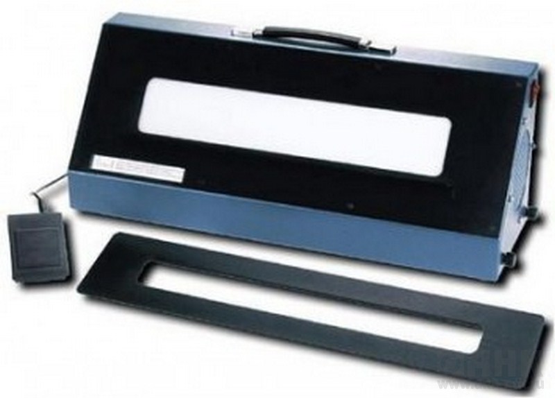 С 3×750 Вт галогеновыми лампами, управлением на фронтальной панели, выключателем с подсветкой, регулятором яркости, ножным выключателем и кабелем, присоединенным снаружи, 3 стекла теплозащитного фильтра, 1 опаловое (молочное) стекло и сдвоенный вентилятор. Максимальная плотность расшифровываемых снимков 3.7. Яркость ~ 50000 Кд/м² (Кд — кандела).