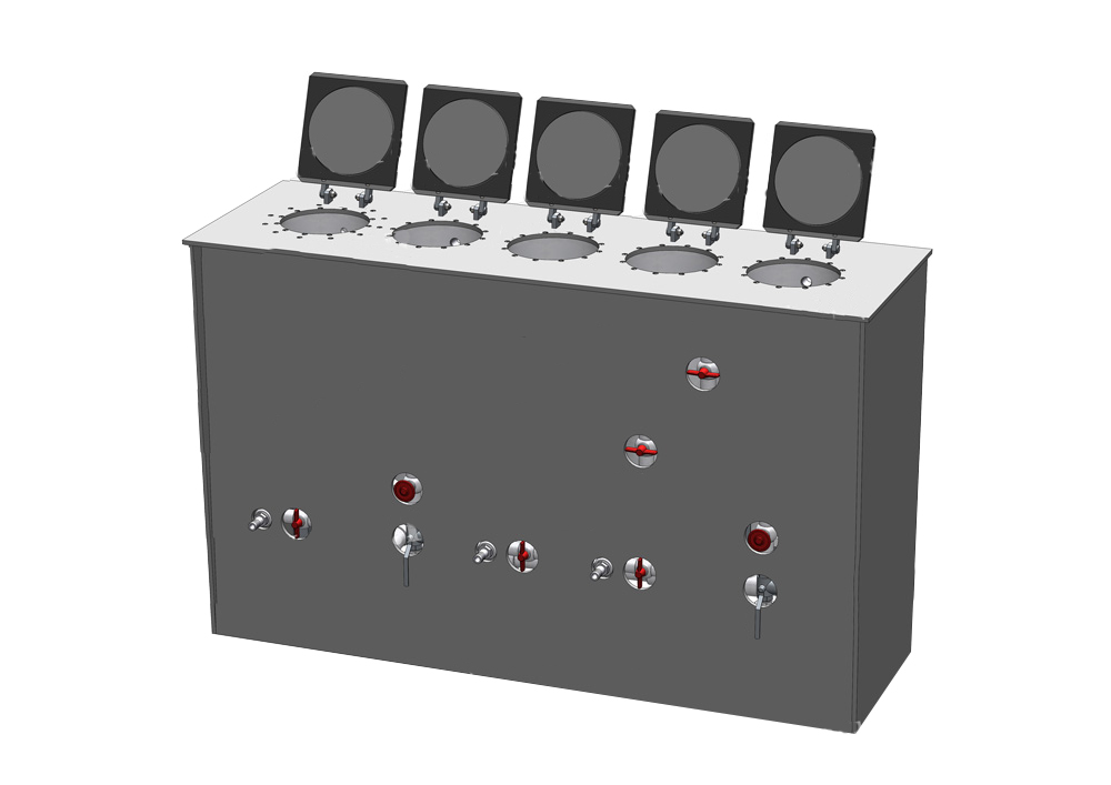 Составляющие элементы установки: бак проявки, бак промежуточной промывки после проявления (проточная вода), бак закрепления, бак промежуточной промывки после закрепления (сборная вода), бак окончательной промывки (проточная вода).