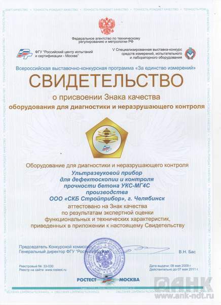 Приборы УКС-МГ4, УКС-МГ4С предназначены для контроля дефектов, определения прочности бетона в сборных и монолитных бетонных и железобетонных изделиях и конструкциях по ГОСТ 17624, определения прочности силикатного кирпича по ГОСТ 24332 и других твердых материалов на основе измерения времени распространения импульсных ультразвуковых колебаний (УЗК) на установленной базе прозвучивания. Снабжены устройством автоматического определения силы прижатия ПЭП с заданием параметров УЗК импульсов, подсветкой дисплея.
