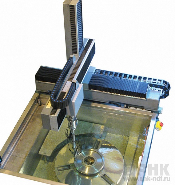 Система построена на базе сканера, оборудованного сервоприводами переменного и постоянного тока, обеспечивающими быстрое и точное управление положением ультразвукового преобразователя относительно контролируемого изделия.