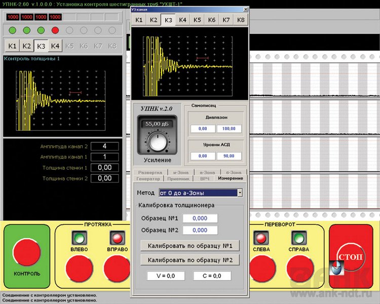 ПК выполняет синхронизацию работы каналов, установку параметров их работы, отображение сигналов УЗК и результатов измерений в реальном масштабе времени. Управление работой дефектоскопа происходит через высокоскоростную параллельную шину, которая формируется с использованием универсальной платы цифрового ввода/вывода. Многоканальный дефектоскоп УПНК представляет собой 8 независимых каналов ультразвукового контроля, которые работают параллельно друг с другом и выполняют всю работу по приему и обработке ультразвуковых сигналов, в соответствии с установленными режимами работы. Дефектоскоп является сертифицированным средством измерения, внесен в Государственный реестр средств измерений (Сертификат RU.C.27.003.A № 30973 от 14.04.2008г).