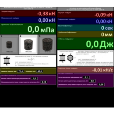 - Определение прочности асфальтобетона на сжатие образцов по методу Маршала на скорости 50 мм/мин, по ГОСТ 12801-98;