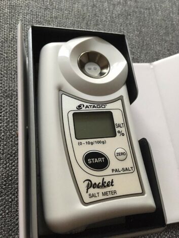 Цифровой солемер PAL-SALT использует метод электропроводимости для измерения уровня солёности растворимых веществ в жидкости. PAL-SALT является первым солемером ATAGO со встроенной функцией оффсeта, позволяющей выводить результаты с автоматическим вычислением поправочного коэффициента. Данную функцию можно использовать, например, для автоматического ввода коэффициента разбавления или для ввода собственного поправочного коэффициента, который позволит получать результаты, согласующиеся с методом титрования. Для калибровки или проверки точности работы солемера Вы можете приобрести ГСО «NaCl» номиналом 2,5%. Поверка солемера PAL-SALT осуществляется в аккредитованной лаборатории АНК и занимает от 1 до 5 дней.